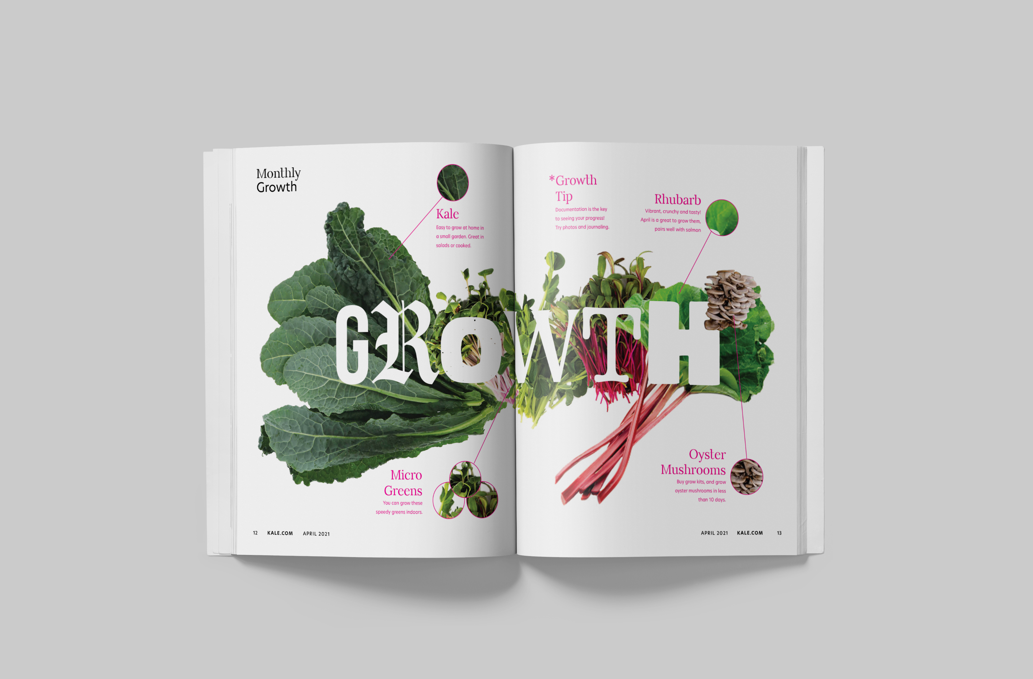 Kale Magazine Spread — Things you can grow at home! — While researching urban gardening I created this spread about foods you can easily grow at home.
